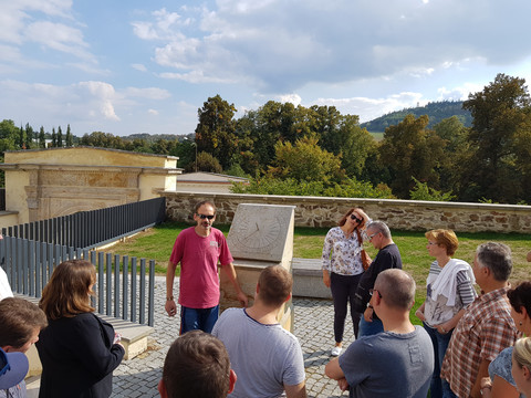 Odpoledne došlo na slibovanou procházku městem. Moravská Třebová, která byla v roce 1980 prohlášena památkovou rezervací, nabízí řadu cenných kulturních památek. Během procházky, obohacené o odborný výklad našeho průvodce, jsme navštívili měšťanské domy, radnici, latinskou školu a kostel Nanebevzetí Panny Marie. Po Schodech mrtvých jsme došli na Křížový vrch ke hřbitovnímu kostelu Povýšení Sv. kříže a k sousoší Kalvárie s nádherným výhledem na město, který umocnilo příjemné slunečné počasí.
